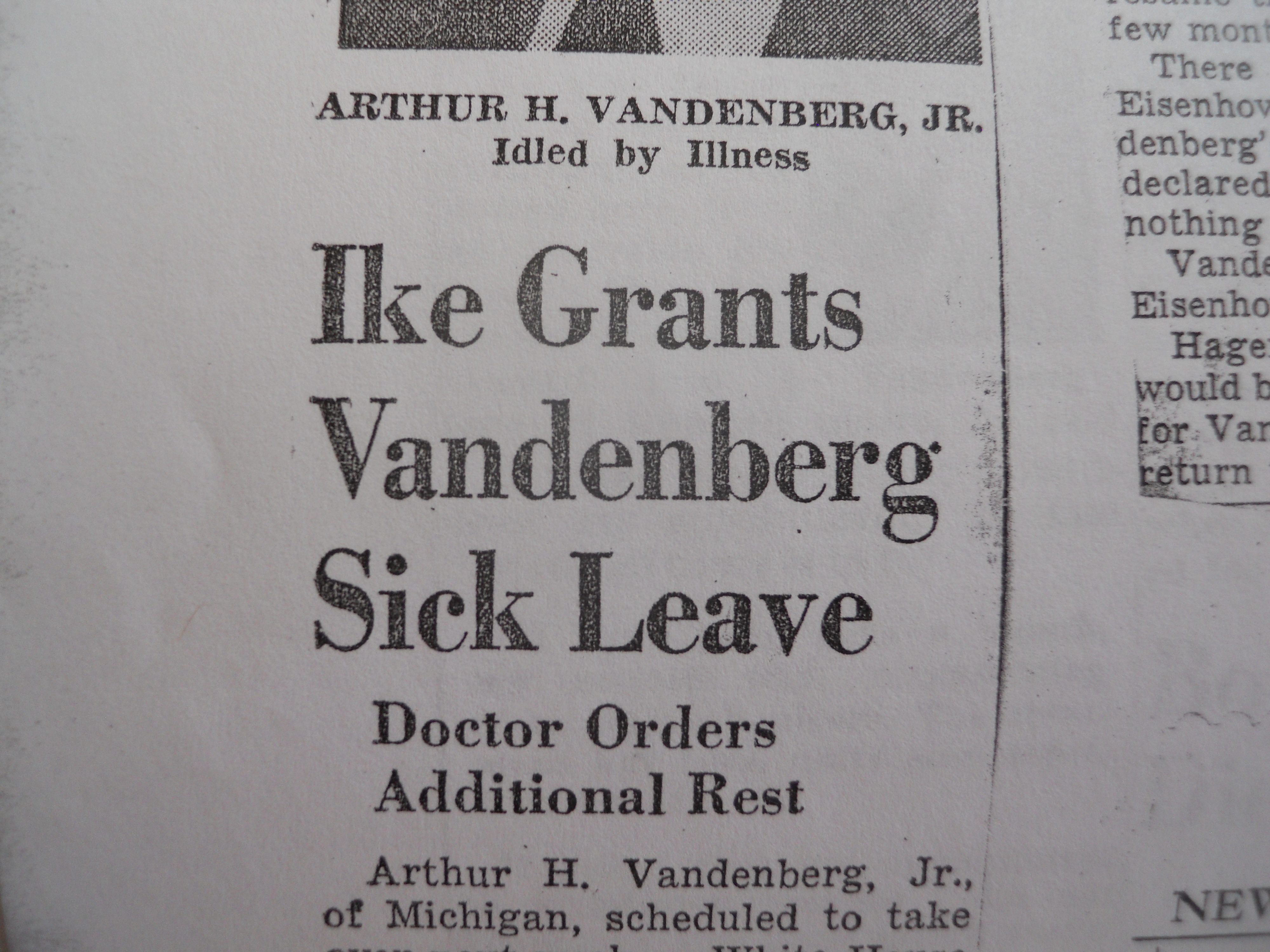 (CF shares with Bob Gray the letter from President Eisenhower terminating Vandenberg: “Dear Arthur, When Mamie and I go off to Washington this weekend, one of our great regrets will be that you are unable to be with us. I am very distressed about your health…I feel in some respects guilty. …Meanwhile, as I know you understand, we have to go ahead with our setup.” (Correspondence, President Dwight Eisenhower to Arthur Vandenberg, Jr., January 17, 1953.)