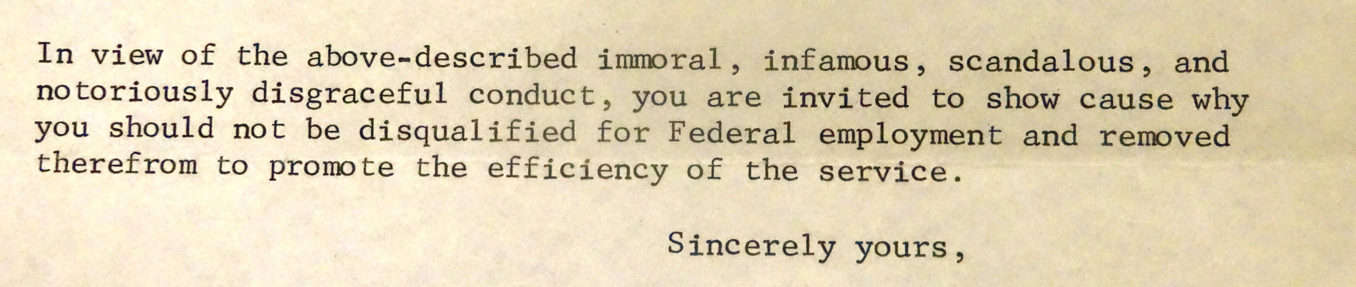Charles W. “Charlie” Baker was fired in 1971 from his job at the National Bureau of Standards for being homosexual. The letter he received from the U.S. Civil Service Commission–sent to his parents’ house–was an outrage: “In view of the above described immoral, infamous, scandalous and notoriously disgraceful conduct, you are invited to show cause why you should not be disqualified from federal employment,” said the animus-drenched letter.