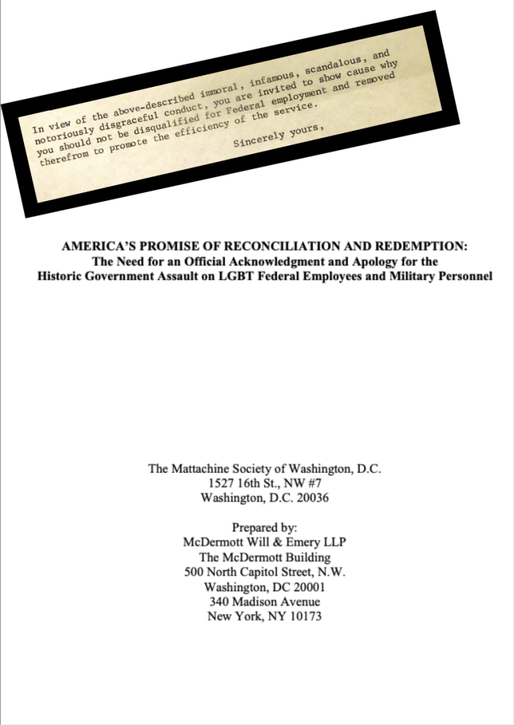 “The time has come,” the Mattachine/McDermott Will & Emery paper begins, “for the U.S. Government to acknowledge and apologize for its mistreatment of LGBT Americans.”